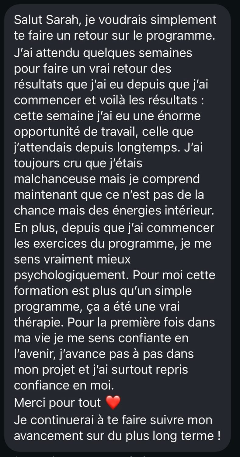 Tu as 14 jours pour tester le programme. Si tu ne ressens aucun changement en ayant appliqué la méthode, alors je te rembourse intégralement.